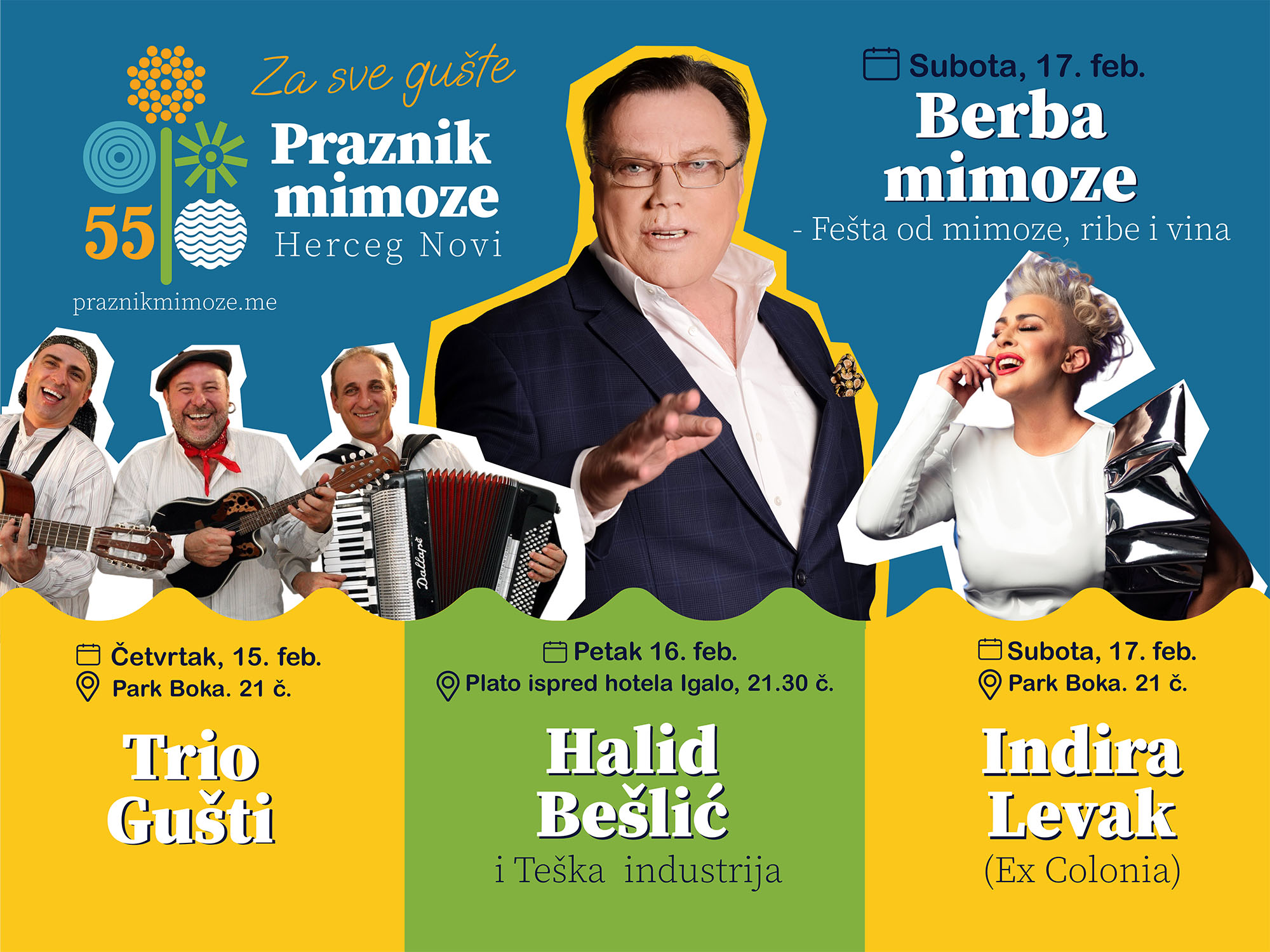 Već 16. februara svečano otvaranje Praznika mimoze uz povorku od 19:30 časova od Trga Nikole Đurkovića do platoa hotela Igalo, atmosferu “zagrijava” bend Teška industrija, a nastavlja regionalna zvijezda Halid Bešlić od 21:30 časova.